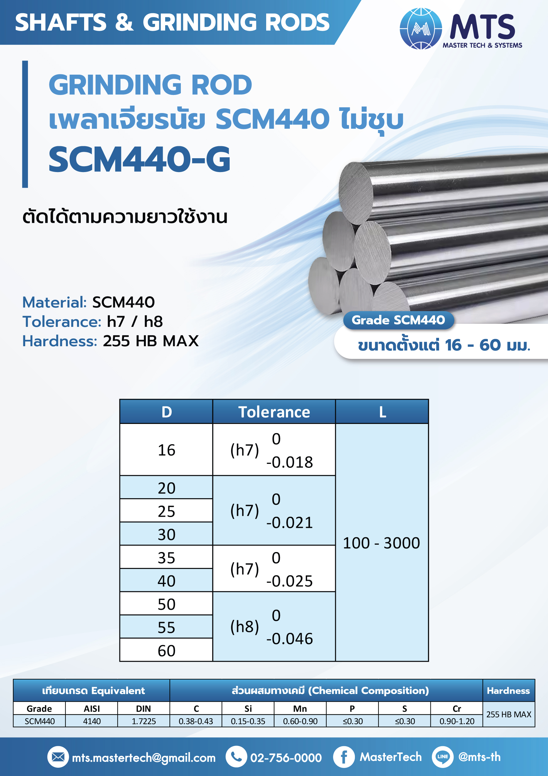 เหล็กเพลาเจียรนัย SCM440 เป็นเหล็กที่ผ่านการเจียรนัยผิวแล้ว ค่าพิกัดอยู่ที่ h7 / h8 และความแข็งอยู่ที่ 255 HB MAX