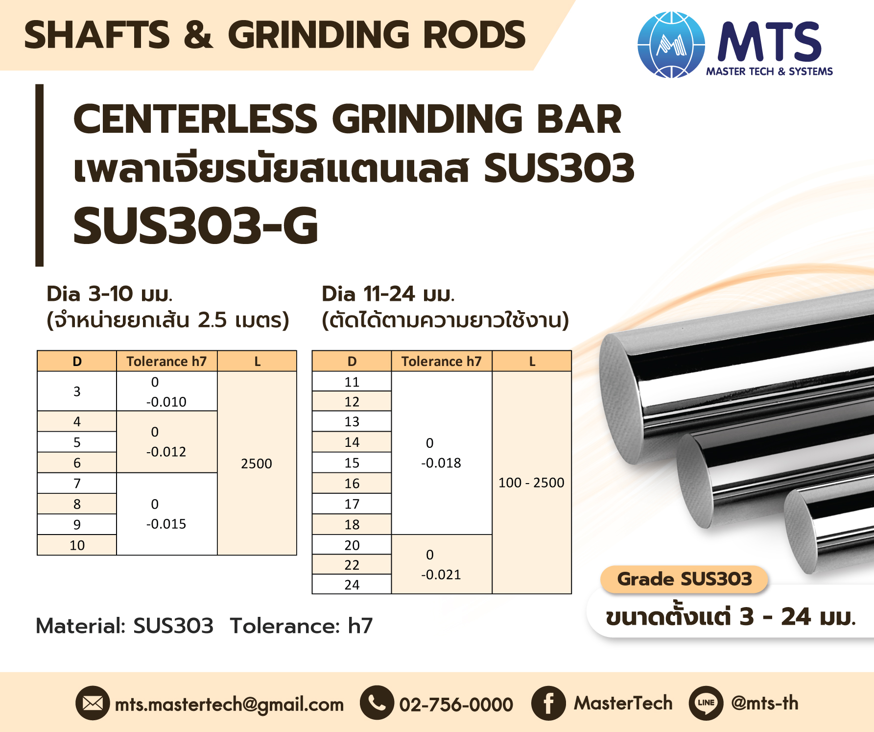 เหล็กเพลาเจียรนัยสแตนเลส SUS303 เป็นเหล็กที่ผ่านการเจียรนัยผิวแล้ว ค่าพิกัดอยู่ที่ h7